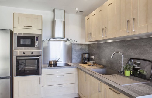 La cocina está equipada con vitrocerámica, lavavajillas, microondas, congelador ....