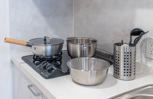 The simple yet practical kitchen is equipped with a gas stove stainless steel sink extractor fan refrigerator and more Cookware and a rice cooker are also provided making it suitable for longterm stays or simple home cooking The garbage sorting area is also clearly organized