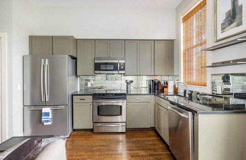 La cocina está equipada con horno, frigorífico y lavavajillas, además de cafetera y tetera, máquina de hielo y microondas. Y gracias a la lavadora y la secadora, podrás viajar con poco equipaje. Otras comodidades de este alojamiento de 2 dormitorios y 2 baños incluyen ropa de cama, aire acondicionado, calefacción y una mesa de comedor.