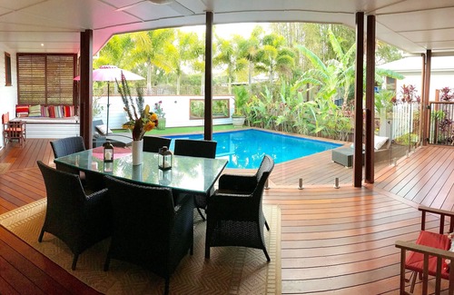 Poco Burns es un retiro de vacaciones y relajado de lujo con los más altos estándares de diseño en estilo clásico weatherboard que concuerden con la arquitectura del Byrons lugares de origen. Disfrutar de la piscina climatizada con energía solar, los 80 metros cuadrados de salas de estar e instalaciones de lujo cubierto al aire libre en el hogar, o dar un paseo a la playa oa la ciudad.