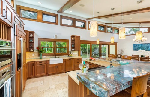 E komo mai (bienvenido) a Hale Niuiki! El amplio plano de planta abierto de la casa conecta a la perfección los espacios de la sala de estar y el comedor con la cocina recién remodelada, lo que permite a los grandes grupos interminables opciones para pasar tiempo juntos. Los pisos de piedra, los elegantes techos con vigas de madera y los muebles modernos brindan un fondo de lujo confortable para su retiro en Hawai.