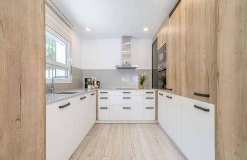 La casa cuenta con 4 dormitorios y 4 baños, con capacidad para hasta 9 personas. Dispone de aire acondicionado en todas las estancias y una cocina americana totalmente equipada con electrodomésticos como nevera, congelador, lavadora, cafetera, horno y lavavajillas.