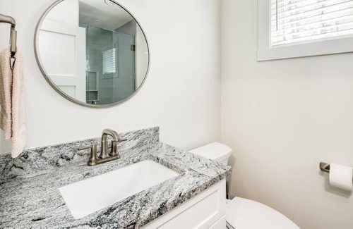 A charming front patio with Adirondack seating welcomes guests onto this 2-story lakefront property, setting the tone for a relaxing vacation. The first-floor great room blends the living, dining, and kitchen areas seamlessly with gorgeous wood-like floors and large picture windows illuminating the room in natural light. The queen sleeper sofa in the living area adds extra flexibility for hosting additional guests, while the 43" TV provides entertainment. When it's time for dinner, the adjacent dining area comfortably seats 6 on plush chairs. The modern and functional kitchen offers guests everything needed to prepare meals easily, including new high-end stainless steel appliances and granite countertops. The real magic of this townhome lies in the details, all designed to make friends and family feel right at home.