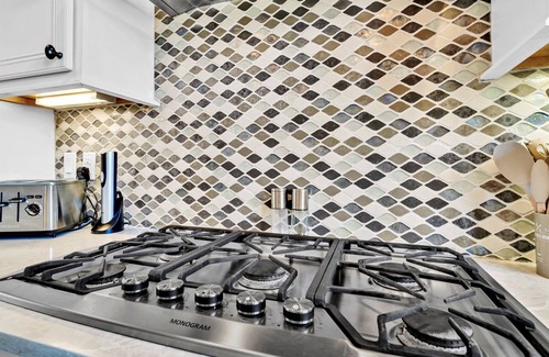 The gorgeous and spacious kitchen has everything you’ll need to make meals at home. The kitchen has updated cabinetry, stone counters, and sleek stainless-steel appliances. We have everything fully stocked with quality dishes, pots and pans and appliances. You’ll enjoy meals at the dining table, breakfast bar, or alfresco in the back yard!