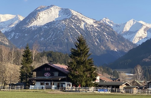 La granja bien cuidado espera a sus huéspedes en una posición panorámica en el sur de Oberstdorf - a sólo 1,5 km del centro. Incluso cuando se conduce la vista sobre los campos verdes cae a los picos de las montañas de los Alpes de Allgäu. Senderos y senderos comienzan justo en la casa. Los 5 apartamentos exclusivos son perfectos para quienes disfrutan de la vida en el campo, pero no quieren perder la comodidad. Los apartamentos están totalmente equipados y con sus balcones y terrazas soleadas oasis de relajación adecuadas. El centro del pueblo con supermercados y tiendas de comestibles, restaurantes, cafeterías y bonitas tiendas se puede llegar a pie en 15 minutos. Pero no solo el hombre encuentra su casa de vacaciones aquí: incluso los caballos pueden esperar la comodidad de un establo bien cuidado, un prado soleado y, por supuesto, un catering de alta calidad. Los perros también son bienvenidos. Además, una práctica veterinaria profesional para caballos y perros está conectada a la granja.