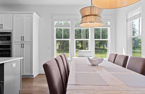 Inside, you’ll find a bright, open-concept layout perfect for gathering with friends and family. The living room invites relaxation with plush seating and a Roku-equipped TV for movie nights. Just beyond, the chef’s kitchen shines with stainless steel appliances, a spacious island with seating for six, and a custom dining table for ten—ideal for group dinners after a day in the sun.
