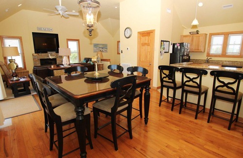 Nivel superior: Gran salón abierto con TV de pantalla plana / DVD / VCR, chimenea a gas y acceso a la terraza, comedor con capacidad para 6 personas con acceso a la terraza, cocina con encimera para 4 personas, medio baño y un porche con mosquitero.