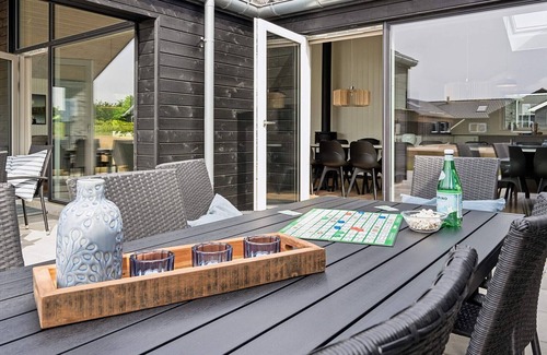 Distribución: Caseta de piscina: salón(TV(canales de televisión alemanes, canales de TV daneses, canales de TV noruegos , canales de TV suecos), instalación estéreo), salón(secadora, lavadora), cocina(fogón(eléctrico), cafetera, microondas, lavavajillas, nevera, congelador(> 250L)), dormitorio(cama doble), dormitorio(cama doble), dormitorio(2x cama individual), dormitorio(2x cama individual), dormitorio(2x cama individual), dormitorio(2x cama individual), dormitorio(2x cama individual), cuarto de baño(lavabo, ducha, váter), cuarto de baño(lavabo, ducha, váter), cuarto de baño(lavabo, ducha, váter), espacio vacío(2x cama individual plegable), espacio vacío(2x cama individual plegable), videoconsola, ducha(exterior), calefacción(radiador(es) eléctrico(s)), muebles de jardín, mesa de ping-pong, futbolín, dardos, billar