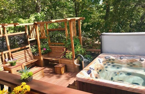Top of the line bañera de hidromasaje para 6 personas en la cubierta inferior con pérgola. Ofrece Bluetooth integrado en la música, tumbona de cuerpo completo, chorros de pies, caídas de agua y una gama de luces de colores para su selección. La vista desde la bañera de hidromasaje ofrece una vista completa de Smith Mountain con increíbles puestas de sol y se encuentra en un entorno muy privado.