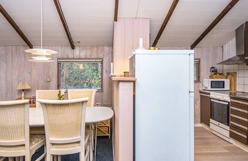 Layout: cocina abierta(fogón(eléctrico), campana extractora, cafetera, microondas, lavavajillas, nevera(+ congelador), congelador(140-199L), lavadora), salón-dormitorio(TV(satélite, canales de televisión alemanes, canales de TV daneses), reproductor de DVD, vídeo, radio, cromado), dormitorio(cama doble), dormitorio(cama individual), dormitorio(2x litera), cuarto de baño(bañera o ducha, lavabo, váter), calefacción(radiador(es) eléctrico(s)), terraza(35 m2), barbacoa