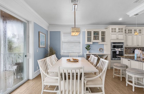 Step inside through the charming entryway and choose your path: take the elevator up from the garage or walk one flight of stairs to the expansive second level. Here you'll find an open-concept layout designed for connection and comfort. The fully equipped kitchen features a spacious island with 4 barstools, perfect for chatting while meals are prepared. A dining table for 8 sits just steps away, making group dinners a breeze. The cozy living room invites you to sink into the U-shaped sectional and enjoy the large flat-screen TV with streaming, YouTube TV, and SONOS speakers. Sliding glass doors open to a screened-in balcony overlooking the canal (and even a peek of the gulf!), furnished with plush seating—perfect for morning coffee or evening cocktails.