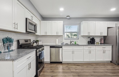 Este alojamiento de 5 dormitorios y 3 baños cuenta con una sala de estar, un comedor, aire acondicionado y escritorio. Pon a prueba tus habilidades jugando al hockey de mesa y al futbolín, o disfruta del wifi gratis, de la televisión y del tenis de mesa. El cuarto de baño incluye un secador de pelo, toallas y papel higiénico. La cocina está equipada con horno, placa de cocina y frigorífico, además de cafetera y tetera, hervidor eléctrico y máquina de hielo. Podrás viajar con poco equipaje, porque tendrás una lavadora y una secadora a tu disposición. Otras comodidades incluyen ropa de cama, una tabla de planchar, calefacción y una silla de oficina.