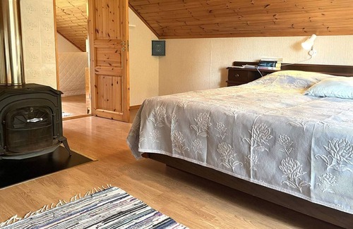 Distribución: cocina(horno de leña, fogón(eléctrico), cafetera, microondas, agua de pozo ), salón-dormitorio(TV(canales de TV suecos)), salón-dormitorio(cama doble plegable), dormitorio(cama doble), dormitorio(2x cama individual), cuarto de baño(lavabo, ducha, váter, lavadora), terraza, muebles de jardín