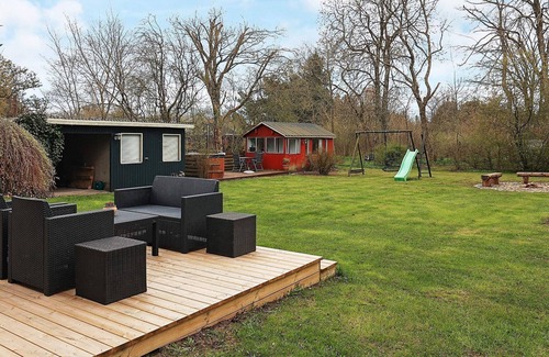 Distribución: Edificio anexo: (2x cama individual) cocina abierta(fogón(eléctrico), campana extractora, cafetera, microondas, lavavajillas, nevera(+ congelador)), salón-dormitorio(TV(canales de televisión alemanes, canales de TV daneses), radio, trona), dormitorio(cama doble, cama infantil), dormitorio(2x cama individual), cuarto de baño(bañera o ducha, lavabo, váter, lavadora), terraza, barbacoa, juegos infantíl, bomba de calor aire-aire