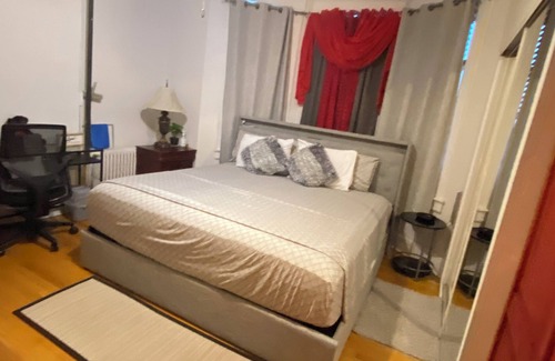 La habitación está diseñada para su privacidad, con una entrada independiente en la parte delantera de una casa de dos familias. El dormitorio, el armario y el baño con jacuzzi están todos aislados del apartamento principal, lo que permite una estadía tranquila en el primer piso.