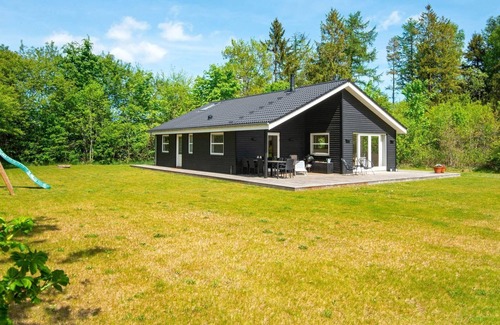 En medio de la hermosa naturaleza de Dinamarca se encuentra esta casa de vacaciones con mucho espacio tanto en el exterior como en el interior. La cabaña rezuma comodidad e idilio y en una noche fría puede calentarse junto a la estufa de leña. La casa está equipada con tres buenos dormitorios y un gran loft, que puede acomodar fácilmente a 4 personas. La casa está equipada con 2 baños y una amplia cocina en conexión directa con el salón, por lo que puedes ser parte de la comunidad incluso si estás en la cocina. Hay varias terrazas junto a la casa, por lo que siempre existe la posibilidad de refugio y sol. La casa tiene columpio. No se alquila a grupos de jóvenes.