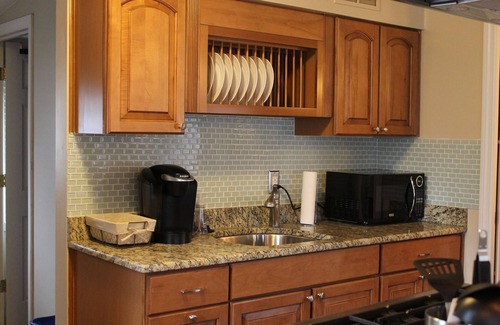 Consiéntase con cualquier refrigerio o bebida que encuentre en la cocina y familiarícese con los platos y utensilios de cocina disponibles. Tenga en cuenta que también hay productos de papel si lo prefiere. Se encuentra un estante para platos en el gabinete debajo del microondas para cualquier plato que pueda necesitar lavado.