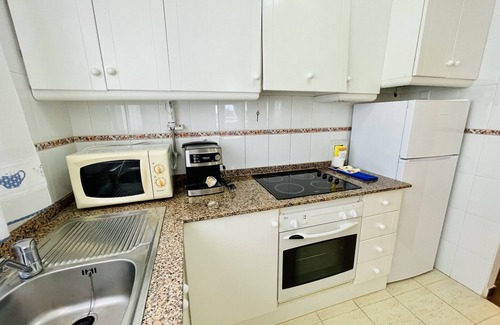 Cocina independiente totalmente equipada con vitrocerámica, nevera, congelador, horno, microondas, hervidor de agua, exprimidor, cafetera, tostadora, vajilla, utensilios de cocina y lavadora.