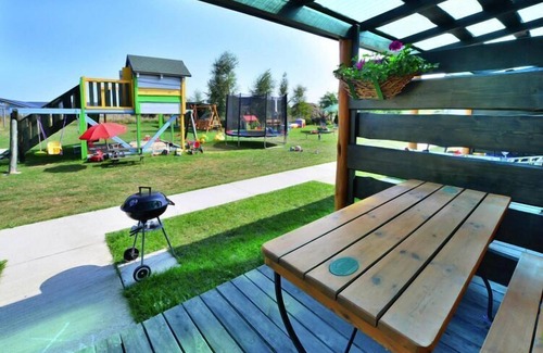 Distribución: Planta baja: (cocina abierta(cocina(2 placas de cocina, eléctrico), tetera, nevera con congelador ), salón-comedor(sofá-cama doble, TV(flatscreen), mesa de comedor), dormitorio(cama doble o 2 camas individuales), cuarto de baño(ducha, lavabo, váter)) Acceso a internet, Parque infantil, Campo para tumbarse, bañera para bebé , calefacción(radiador(es) eléctrico(s)), terraza(cubierta), jardín(compartido con otros huéspedes, vallada, 1500 m2), muebles de jardín, tumbonas, barbacoa(carbón), aparcamiento, cama elástica(compartido con otros huéspedes), arenero(compartido con otros huéspedes), juegos infantíl(compartido con otros huéspedes), tobogán(compartido con otros huéspedes), bicicletas disponibles, trona, Campo de voleibol, baby crib(free)