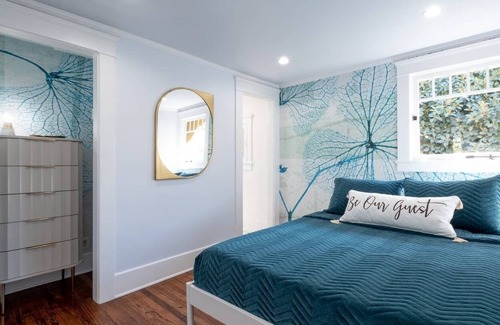 The Carriage House es privado y completamente separado de la casa principal, con su propia entrada privada. La cama es súper cómoda y las sábanas son lujosas y acogedoras. Una sala de estar espaciosa y abierta incluye empotrados originales y pisos de madera noble de roble, espacio para trabajar de forma remota y un televisor inteligente de pantalla plana de 42 ".