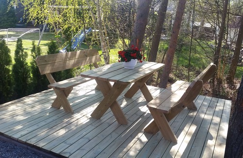 Partes de nuestro jardín se pueden utilizar para relajarse y hacer barbacoas. Disponemos de una pequeña barbacoa de carbón. También disponemos de una zona de escalada con columpios y un tobogán para niños.