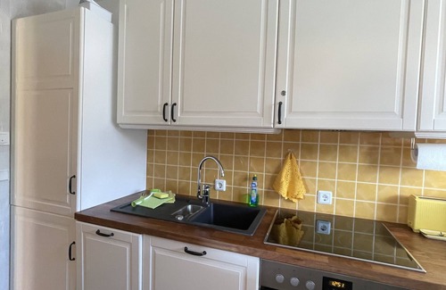 El apartamento es ideal para 2 personas y tiene un baño con ducha grande y un aseo separado. La cocina está equipada con lavavajillas, microondas, horno, vitrocerámica, frigorífico / congelador, hervidor, tostadora, interruptor Senseo, cafetera normal y una cocina para huevos.