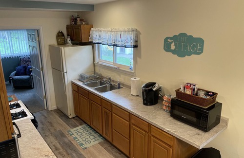 Cottage puede alojar hasta 6 personas con un dormitorio de matrimonio, un dormitorio de tamaño completo y un futón de tamaño completo en la sala de estar. Toda la ropa de cama, productos de papel y café se proporcionan. En la cocina encontrará un refrigerador grande, cocina a gas con horno, microondas, horno tostador, tostadora y cafetera junto con ollas, sartenes y platos.