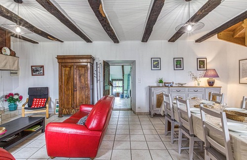 La casa da la bienvenida a sus huéspedes en una fantástica ubicación en el borde del Lot, cerca de la hermosa naturaleza. Las habitaciones, rústicas y amuebladas con estilo, son el marco ideal para pasar unos días maravillosos en compañía de su perro. Después de un día lleno de acontecimientos, relájese en el sofá en un ambiente acogedor, vean juntos una película y charlen largo rato mientras crepitan las llamas de la estufa de leña.