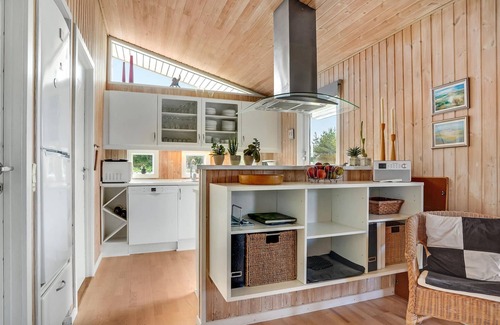 En una atractiva y amplia parcela natural, no lejos de una de las playas de baño más largas de Dinamarca y tanto de bosques como de tiendas, se encuentra esta hermosa y muy bien mantenida casa de vacaciones de madera.