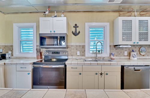Capacidad para 6 personas con una cama queen en el dormitorio principal (con vista al río), una cama queen y literas gemelas en el segundo dormitorio. Tiene una gran mesa de comedor estilo granja con asientos adicionales en un gran bar central. ¡Las ventanas se alinean en la pared de la sala para que pueda disfrutar de la observación de aves, la natación con delfines y los amaneceres desde la comodidad del sofá!