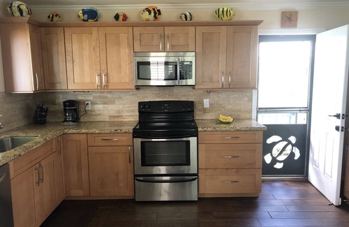 La casa se encuentra a unos 18 pies sobre la playa. El acceso a la playa es a través de escalones en la pared del mar. Se requiere buena movilidad para los pasos hacia el océano. Otro acceso a la playa desde la casa es de dos a tres casas al final del camino por el parque de la playa. Justo enfrente de la casa es una superficie rocosa / piedra arenisca plana con playa de arena más lejos a la derecha ya la izquierda de la casa. El acceso al agua directamente en frente de la casa es sobre una superficie de arenisca y una plataforma de lava / coral.