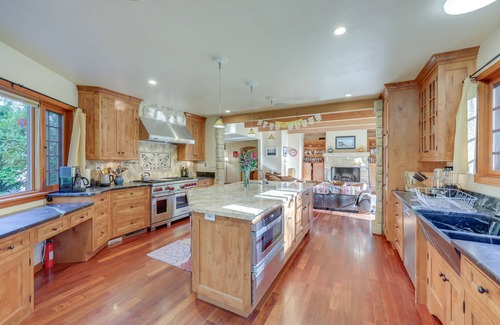 La cocina cuenta con una isla con encimera de granito segundo fregadero, encimeras de piedra de jabón, armarios de madera de nogal hermosas, y una de seis quemadores Lobo gama / estufa con una plancha incorporada. Otras características incorporadas incluyen un sistema de alta fidelidad de alta calidad con altavoces en cada habitación, un centro de entretenimiento sala de recreo con una gran televisión de pantalla plana, y un sistema de sonido envolvente de alta calidad.