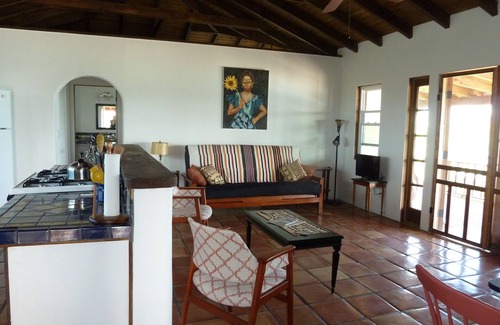 Terminada en 2017, la casa cuenta con 2 habitaciones, cada una con una cama queen y baño privado completo. Las habitaciones están separadas por una gran sala para la máxima privacidad. La gran sala incluye una cocina totalmente equipada, sala y comedor. La sala de estar incluye un estéreo bluetooth y un televisor inteligente con Apple TV. Todas las habitaciones tienen WiFi de alta velocidad. Las dos habitaciones y la gran sala dan al océano con puertas francesas que se abren a una cubierta cubierta envolvente. Hay ventiladores de techo en toda la casa y muchas ventanas para proporcionar una buena brisa cruzada. Ambas habitaciones tienen aire acondicionado. Una sala de pantalla en el lado oeste de la cubierta es ideal para hacer barbacoas, cenar, descansar y ver la puesta de sol durante la cena.