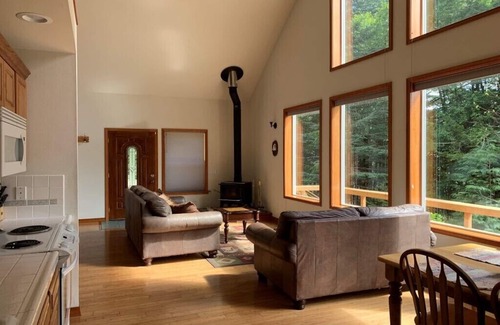 La casa de estilo cabaña tiene dos habitaciones con camas queen size, dos baños completos y un loft con futón tamaño cama doble, con capacidad para seis personas. La casa es de reciente construcción con cocina completa. Un fuego en la estufa de leña en la sala de estar proporciona un valor estético en una tarde fresca. La bomba de calor sirve a la casa para calefacción y refrigeración. El agua doméstica proviene de un manantial subterráneo y se trata con pureza UV.