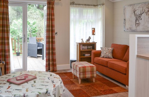 Sala de estar: con chimenea eléctrica con efecto de leña, TV con canales Freeview de 55 ", reproductor de DVD con una selección de DVD y puertas francesas que conducen al área de descanso cubierta.