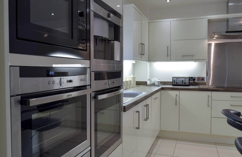 Cocina / comedor: estilo de cocina con barra de desayuno, horno eléctrico, horno de vapor, placa de inducción de 5 anillos, cajón calentador, microondas, refrigerador para vinos, lavaplatos, cafetera, Sky TV de 40 ", sistema de música Sonos con altavoces Bose, suelo de baldosas y puertas de doble pliegue que conducen a terrazas.