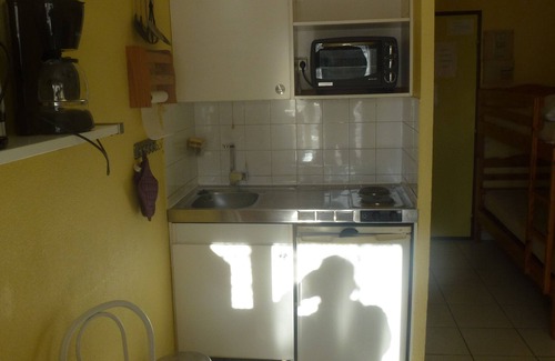 Habitación principal con cama de 140 cm, equipada con una pequeña cocina, área de cabina con 2 literas de 80 cm para ciertos apartamentos de 4 personas (capacidad para 2 personas, sofá cama y cama doble para 2 personas)