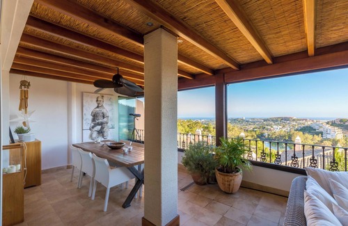 Al salir a través de las grandes puertas de cristal, una encantadora terraza cubierta de estilo ibicenco con muebles de alta gama de club de playa establece el entorno perfecto para disfrutar de un momento relajado. A su izquierda hay una enorme mesa de comedor de madera con sillas de comedor de luz blanca y encima un ventilador bellamente detallado sopla aire fresco sobre usted. Al otro lado de la terraza, hay una acogedora zona de estar con dos sofás y una preciosa mesa de madera. Toda la terraza tiene persianas que se pueden quitar para dar paso a un espacio abierto que le ofrece la vista más impresionante del mar, las montañas, los campos de golf y un lago. En el apartamento también hay un servicio de transmisión de música por Internet Yamaha Music Cast/Deezer en todas las habitaciones, que se puede controlar desde su teléfono y también una caja de televisión de Apple.