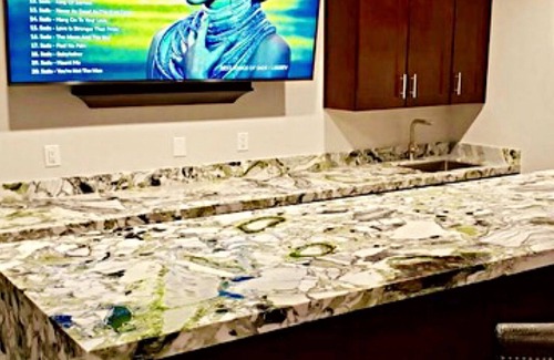 La cocina es apta para un chef con una gran nevera, horno, microondas y máquina Keurig. El granito ayuda a completar el aspecto con los hermosos gabinetes de roble. Platos, ollas, sartenes y utensilios, todo incluido, solo traiga su comida y condimentos y estará listo para comenzar. El wifi y el sonido envolvente con una gran cantidad de opciones de canales y televisores de alta definición te hacen sentir como si estuvieras en el cine sin el costo.