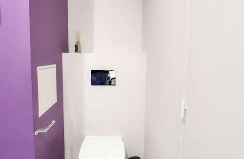 - un cuarto de ducha con lavabo, secador de toallas y WC