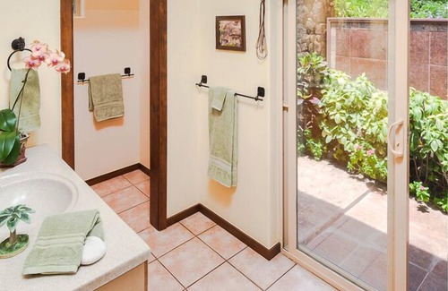 El baño embaldosado con tocador grande se abre a su exótica ducha privada al aire libre, rodeada de paredes de roca de lava roja y plantas tropicales.