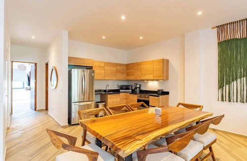 Escondido en la exuberante selva de La Veleta, este apartamento te transporta a la magia de México. Puedes disfrutar de un chapuzón en la piscina compartida y relajarte en el jacuzzi. También hay un gimnasio compartido, una zona de barbacoa y una terraza privada, perfecta para tomar algo por la noche. En el interior, las habitaciones son sencillas, frescas y adecuadas para familias. Hay estacionamiento privado disponible, y el centro de Tulum está a solo unos minutos en coche.
