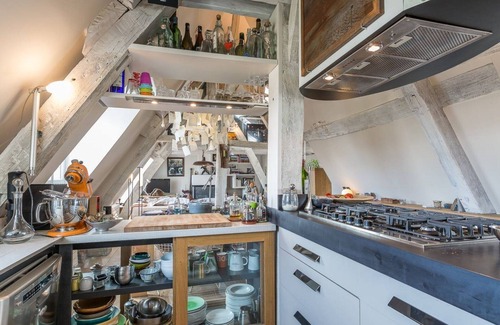 Estos son áticos que han sido completamente reacondicionados por el arquitecto propietario. Sumérjase en un universo único hecho de viejas vigas de madera, azulejos de época, objetos inusuales, recuerdos de viaje, creaciones únicas (hay que decir que los propietarios están en el diseño). El apartamento esconde en sus recovecos piezas insospechadas, hábilmente camufladas de almacenamiento. Ofrece grandes sorpresas: ¡como esta bañera con vistas a los tejados de París que le permite ver todo sin ser visto! Esta ducha con vista al cielo ... O esta habitación doble que desaparece bajo las cortinas en el pasillo. La sala de estar es extremadamente amigable y cálida, con una hermosa cocina totalmente equipada con calentadores de gas que será adecuada para los "chefs de passage". Ventanas en cada habitación (5 en la sala! ), y en todo el apartamento dan una luz muy hermosa a todo el apartamento.