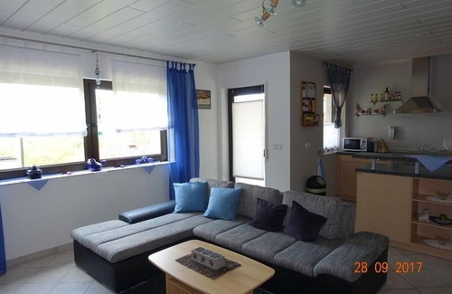 El apartamento de 60 metros cuadrados con vista al jardín y al campo es para máx. Apto para 5 personas, ideal para 3-4 personas. Es moderno y tiene un dormitorio con dos camas individuales y un dormitorio con una cama doble. En el salón hay un sofá cama para 2 personas. Bajo petición, se puede proporcionar una cuna y una silla alta para los niños por un suplemento. El baño está equipado con una ducha de bienestar, inodoro, radiador de toallas y secador de pelo. La cocina cuenta con vitrocerámica, horno, lavavajillas, extractor, microondas, tostadora, hervidor de agua, cafetera y filtro de máquina, electr. Multi pan, parrilla de contacto, platos, ollas, sartenes y está completamente amueblado. Una terraza cubierta con toldo, sombrilla, tumbonas y muebles de jardín le invita a relajarse. Un televisor Sat Led, radio por internet y WiFi están disponibles. Además, hay una zona de barbacoa cubierta, caseta de jardín, muebles de jardín, tarta flambeada, parrillas de madera y carbón.