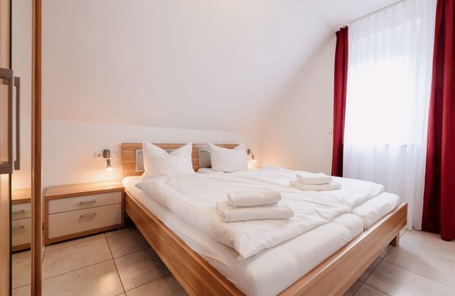 El moderno apartamento de 38 metros cuadrados está clasificado con cuatro estrellas y tiene capacidad para 2 personas. El dormitorio tiene una cama doble y un amplio armario. La sala de estar está amueblada con un cómodo sofá de cuero, sillones de cuero, una cocina completamente equipada y un comedor. El baño tiene ducha y aseo. Todo el apartamento tiene calefacción por suelo radiante y persianas eléctricas. Un alquiler para mecánicos no es posible. En el siguiente enlace puede ver el apartamento en el video: https: // www. youtube. com / watch?v = N6oFi46N-WQ