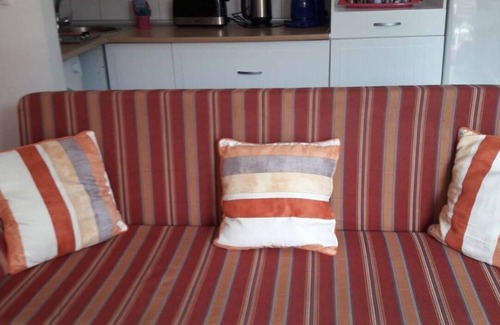Sala de estar: mesa, sofá cama (135x195), TV LED de 32 ", piso laminado, puertas corredizas panorámicas con vista a la costa y acceso directo a la terraza con palmeras, vista maravillosa, comedor: con mesa de vidrio y 3 sillas