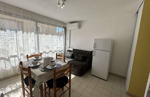 La residencia Les Salines está situada en el centro de la ciudad, a dos pasos de la playa, del puerto y de los comercios. Este apartamento de vacaciones está equipado para 4 personas, consta de una entrada con dos literas, un dormitorio con una cama doble de 140, un baño con ducha y WC separados, una pequeña cocina con placas de cocina, frigorífico, una sala de estar con un sofá cama y una televisión.