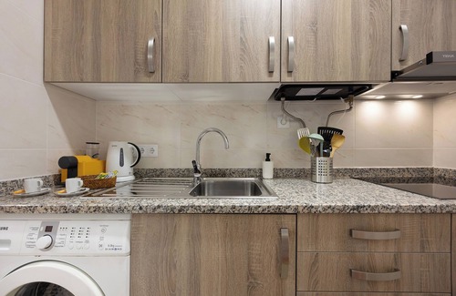 También tiene un baño con ducha, un bonito salón con sofá cama y una cocina americana totalmente equipada.