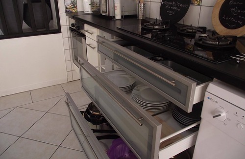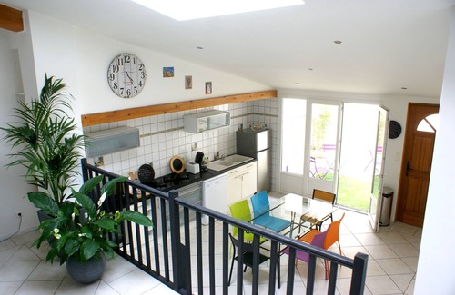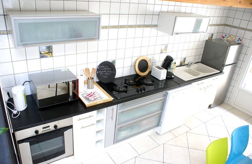 cocina, equipada con encimera (vajilla, cubiertos y utensilios de cocina, horno, microondas, encimera de gas 4 fuegos, campana, nevera, cafetera Senseo, cafetera, tostadora ...) sala de estar abierta amueblada con 1 doble y 1 sofá fijo, mesa de café, TV, fibra de banda ancha Wi-Fi.