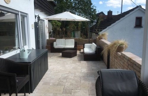 El apartamento de aproximadamente 80 metros cuadrados fue renovado en 2019 y amueblado. Tiene una puerta de entrada independiente, amplio salón, cocina grande, dormitorio de 20 m² con cama doble (1,60 m) y cama plegable (1,60 m). Además, hay un pequeño baño de visitas, un baño con ducha y bañera y una terraza de 40 metros cuadrados con vistas al valle del Rin.